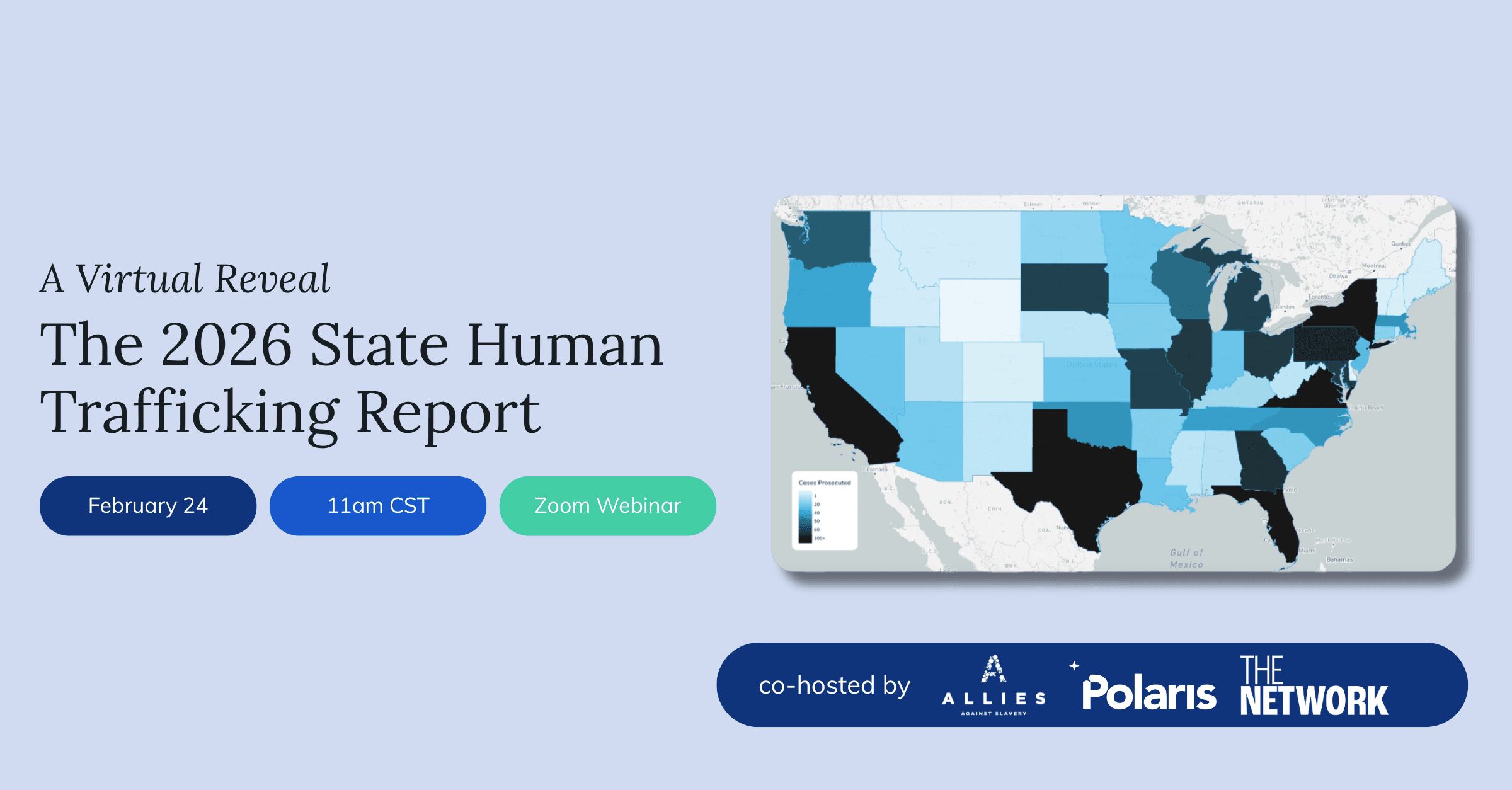On February 24, we held a webinar, A Virtual Reveal: the 2026 Human Trafficking Report, which drew over 650 registrants and achieved a 60% attendance rate across 42 states and 469 organizations. We were honored to host six speakers from four separate organizations, which yielded a rich discussion. We invite you to watch the webinar and explore the full 2026 State HT Report here.