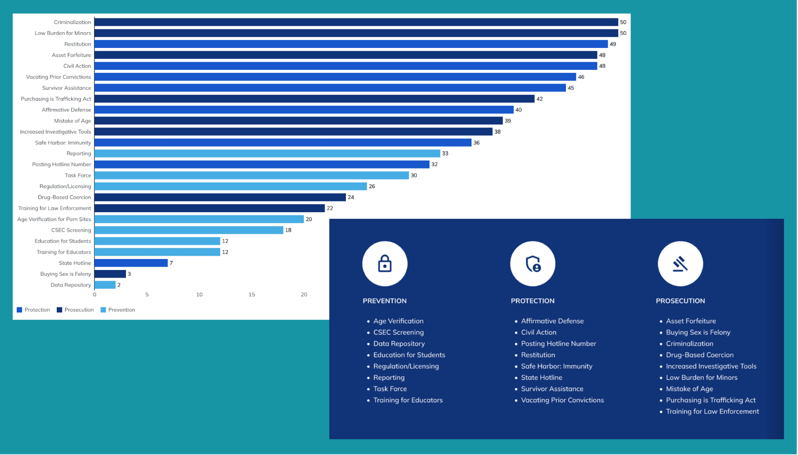That means for every two prosecution or protection policies passed, roughly one prevention policy exists. Prevention is not just lagging. It is structurally underrepresented in state anti-trafficking frameworks.
