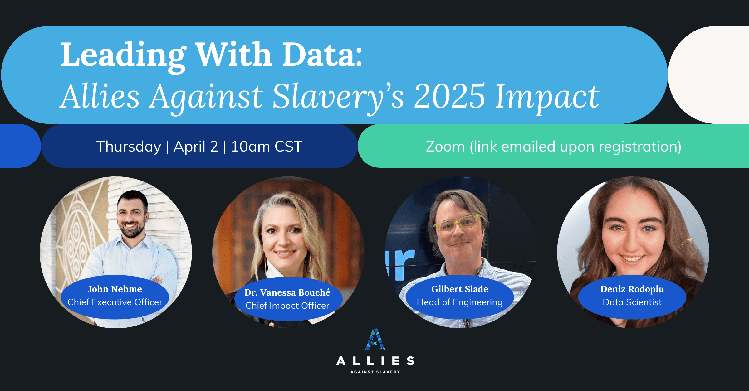 On April 2, we hosted an exclusive briefing for our funding partners to share the impact their support made possible in 2025. The webinar highlighted Allies Against Slavery’s expanded data-driven efforts, including over 42,000 screenings conducted, thousands of youth identified as at risk, the integration of national datasets, and contributions to federal and state policy. We were honored to feature Allies team members across program areas, offering a comprehensive look at this work. We invite you to learn more about our 2025 impact and continued efforts here.
