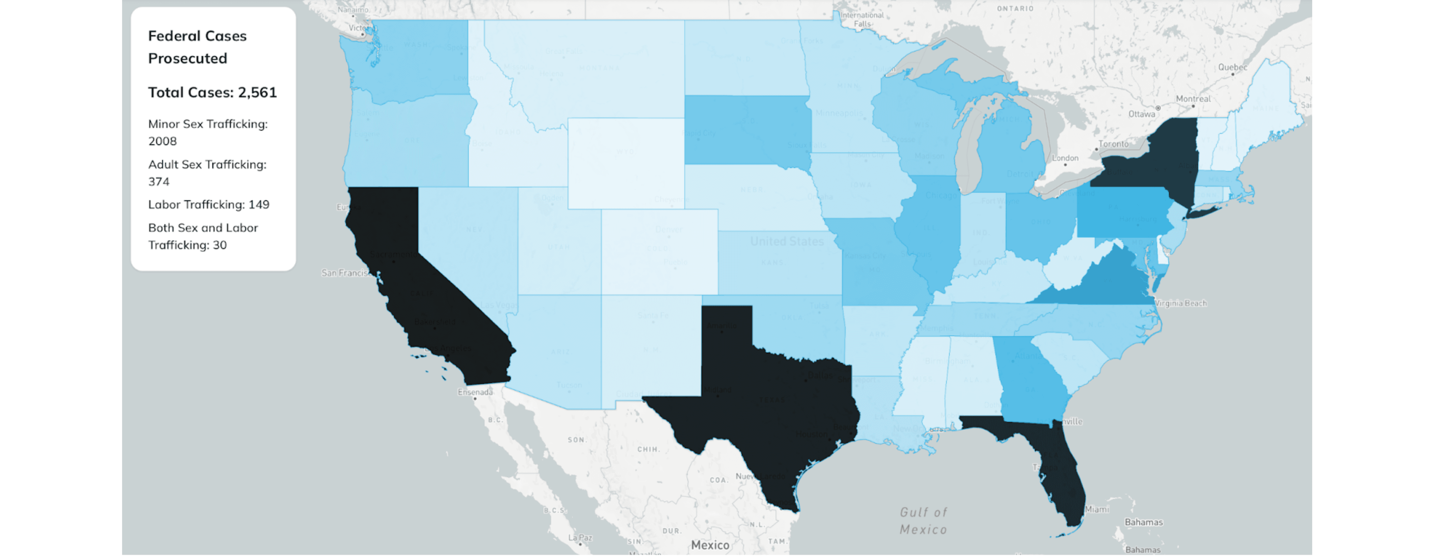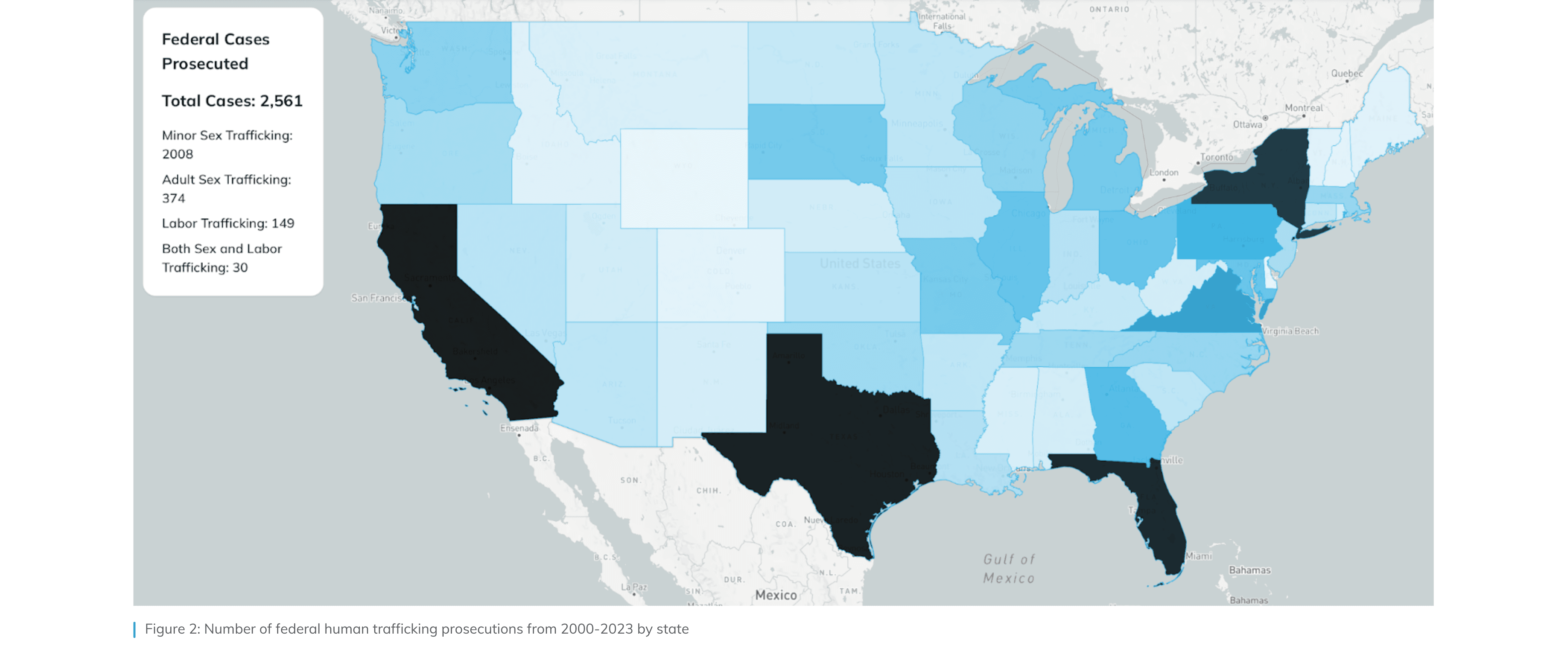 To assess enforcement, the report examines federal human trafficking prosecutions from 2000 to 2023. During this period, more than 2,500 cases were prosecuted federally, involving over 4,800 defendants and more than 12,500 identified victims. Minor sex trafficking cases dominate federal dockets, far exceeding adult sex trafficking and labor trafficking cases combined. This imbalance reflects legal standards, sentencing structures, and prosecutorial priorities rather than underlying prevalence. While populous states account for the highest number of prosecutions overall, per capita analysis reveals that smaller states lead in enforcement intensity.