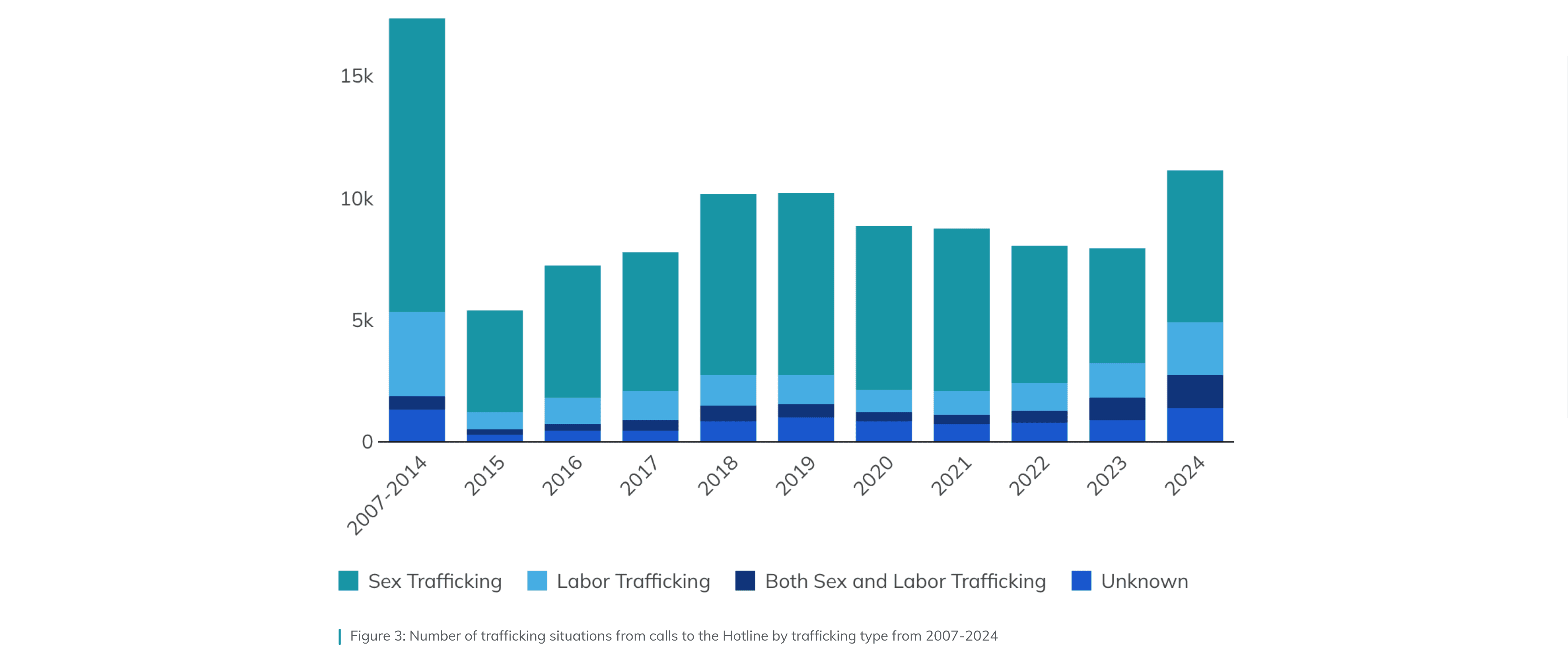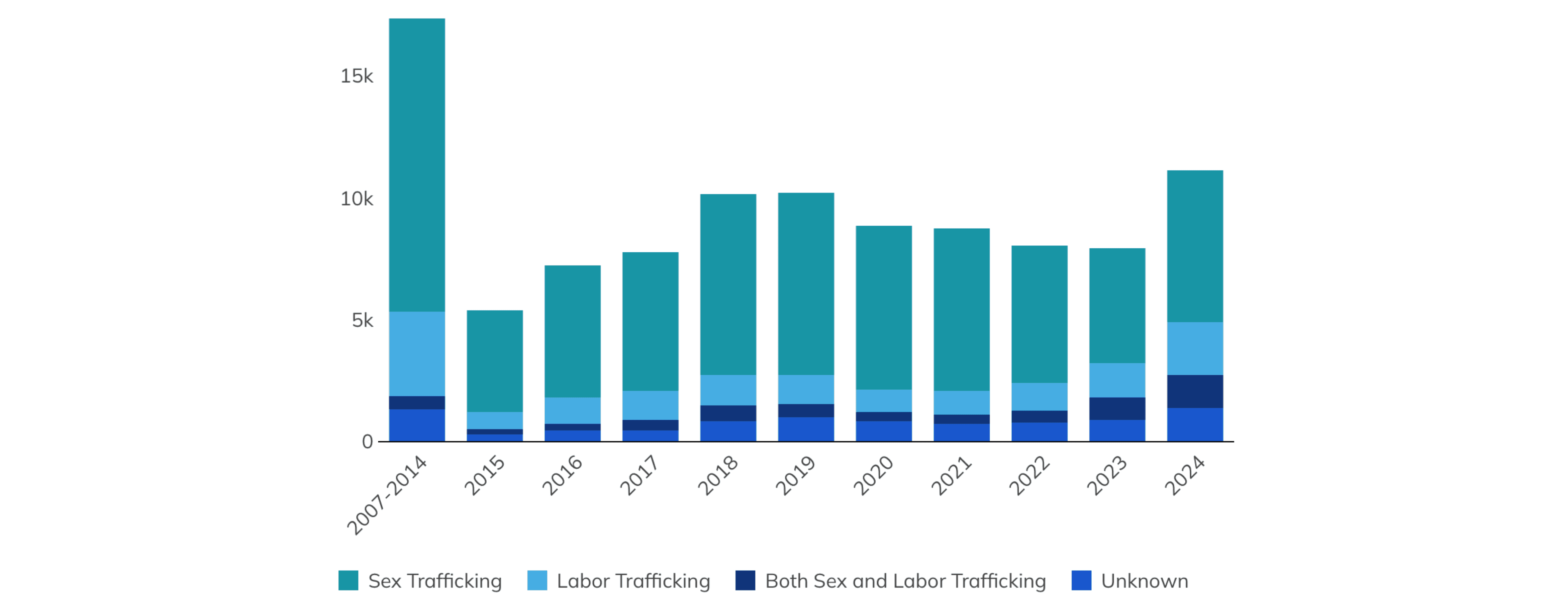 Beyond the justice system, the report incorporates National Human Trafficking Hotline data, capturing over 100,000 reported trafficking situations since 2007. This data highlight where victims, service providers, and community members are reporting concerns and seeking help. The vast majority of cases reported to the hotline involved sex trafficking. Hotline data also includes information on trafficking venues, highlighting common settings associated with both sex and labor trafficking across reported cases. For sex trafficking, the top three known venues were illicit massage spa business, hotel/motel based, and residence based commercial sex. For labor trafficking, the top three known venues were domestic work, agriculture farms, and restaurant food services.